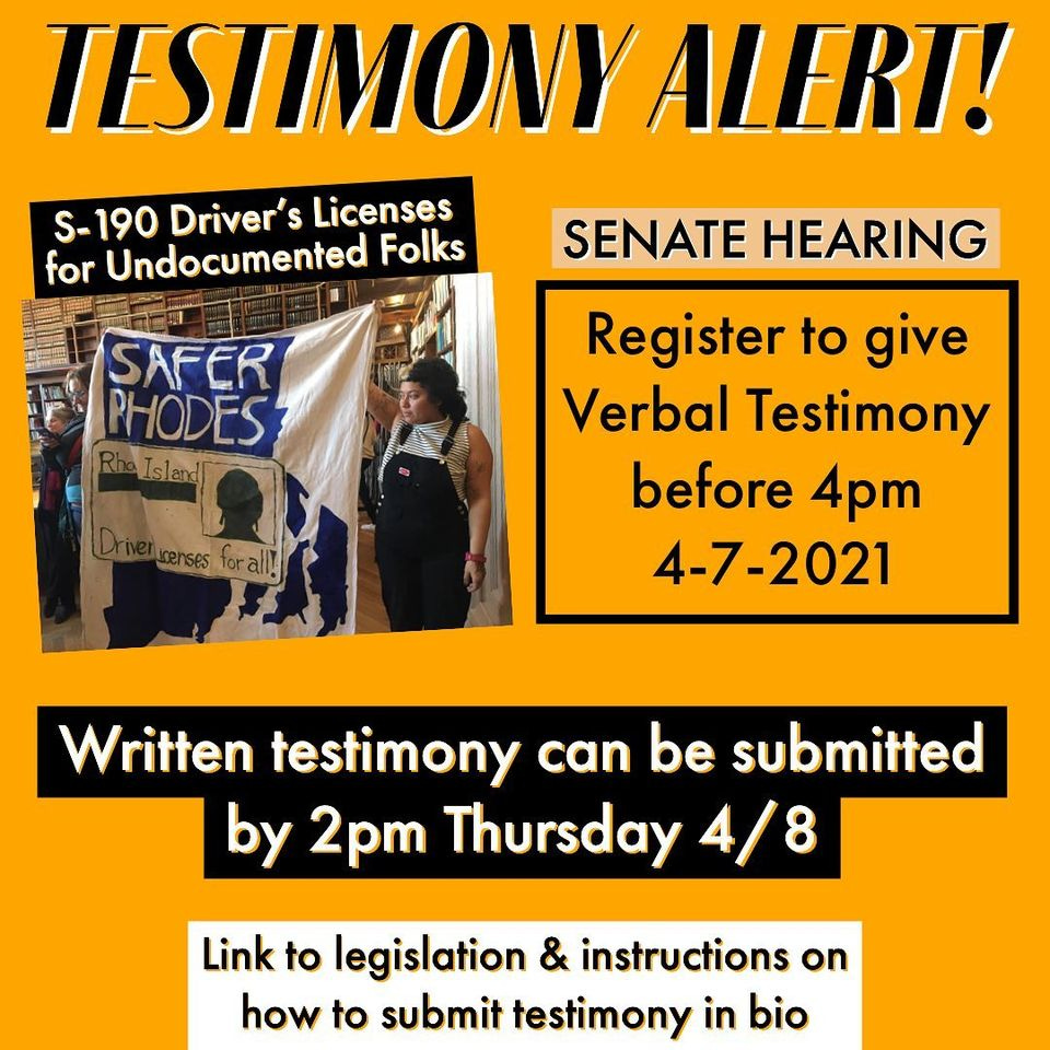 TODAY, 4/7, BY 4pm (to sign up) / TOMORROW, 4pm and onward (to testify), remotely: Sign up here to testify in favor of Senate Bill 190, which provides for drivers’ licenses for undocumented Rhode Islanders. This would give people increased freedom of movement and the ability to access basic needs (groceries! doctors’ appointments!), earn money (jobs that aren’t on the bus line/are too far to walk or bike to!) and help family and friends.